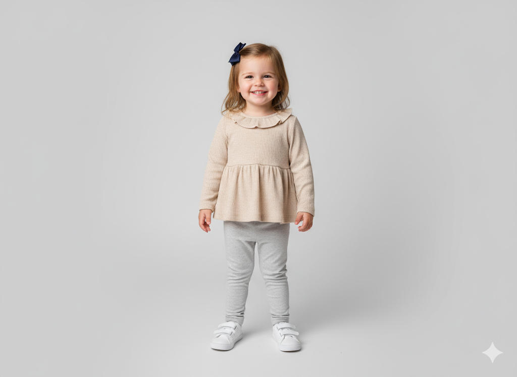 This adorable long-sleeve top from Mayoral combines comfort with sweet style, perfect for your little one. Crafted from soft, ribbed fabric in a versatile beige hue, it features a charming ruffle collar and a gently gathered peplum hem for a touch of elegance. Ideal for both everyday wear and special occasions.