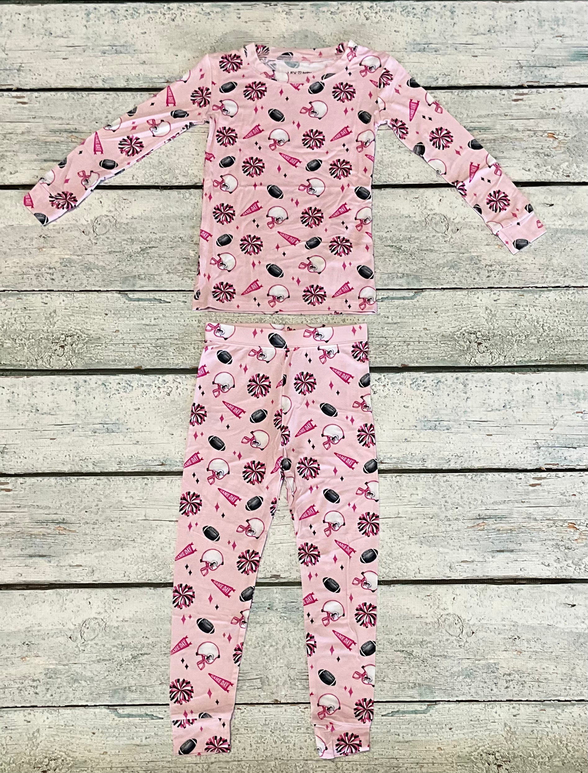Cheer on sweet dreams in our Taylor Football Pajama Set! Featuring a fun and playful mix of pink football helmets, pom-poms, “Go Team” banners, stars, and footballs, this 2-piece set brings sporty spirit to bedtime. The long sleeve top and matching bottoms are made for cozy comfort and all-night snuggles—perfect for little fans who love a touch of team pride with their PJs.