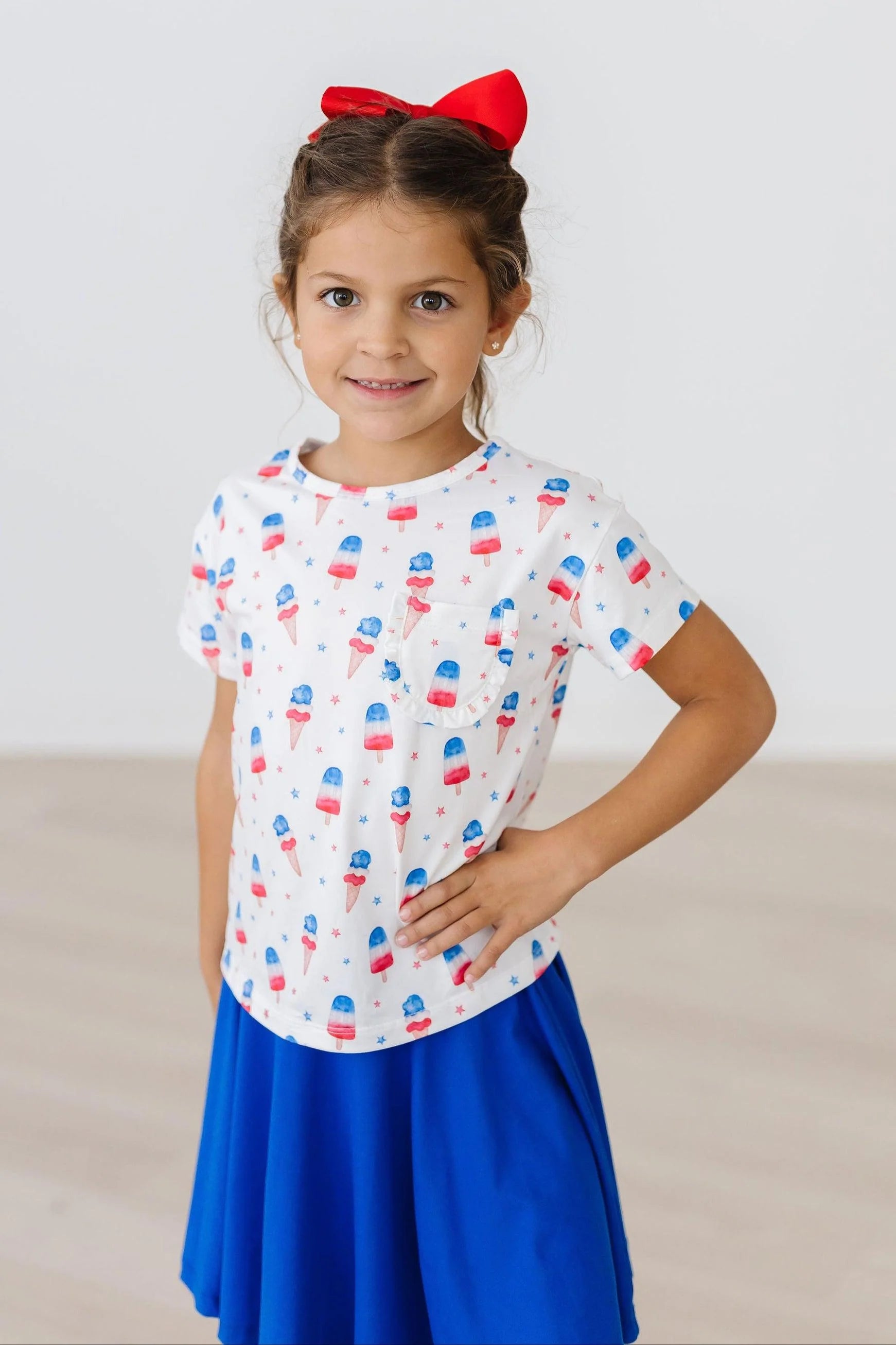 Our Ruffle Pocket Tee is the perfect trendy basic. Boxy fit pairs great with leggings or shorts. Slightly cropped, but still long enough to cover the tummy. Great for casual days at school or the playground. Mila loves wearing this tee for her hip hop classes because it is trendy but still girly.