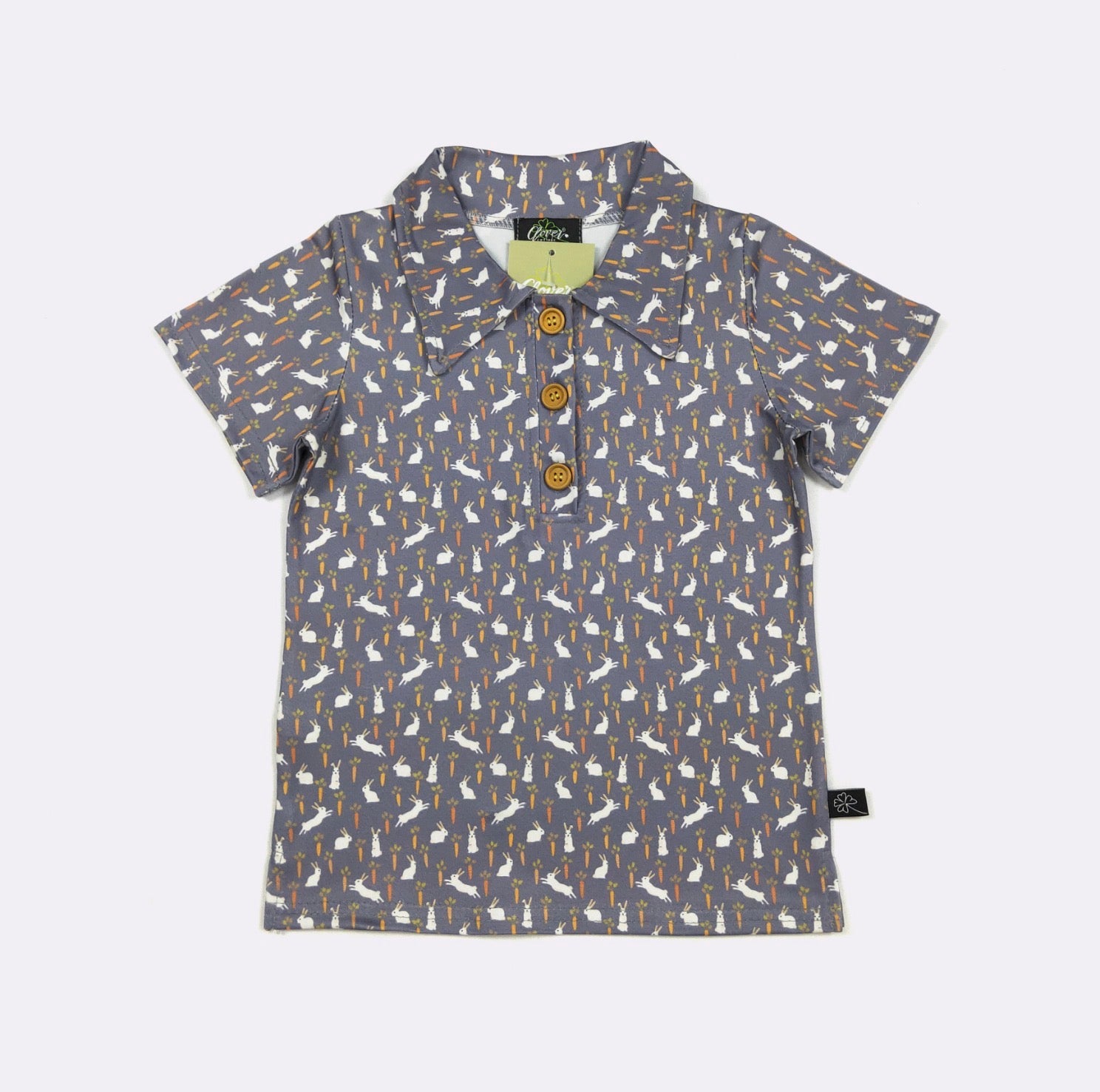 This collared shirt is one of those pieces that looks put-together without trying too hard. Made from a soft, stretchy knit, it’s comfy enough for all-day play but polished enough for family photos or special outings. The sweet bunny-and-carrot print adds a playful touch without being loud, and the neutral gray tone makes it easy to mix and match with shorts, denim, or joggers.