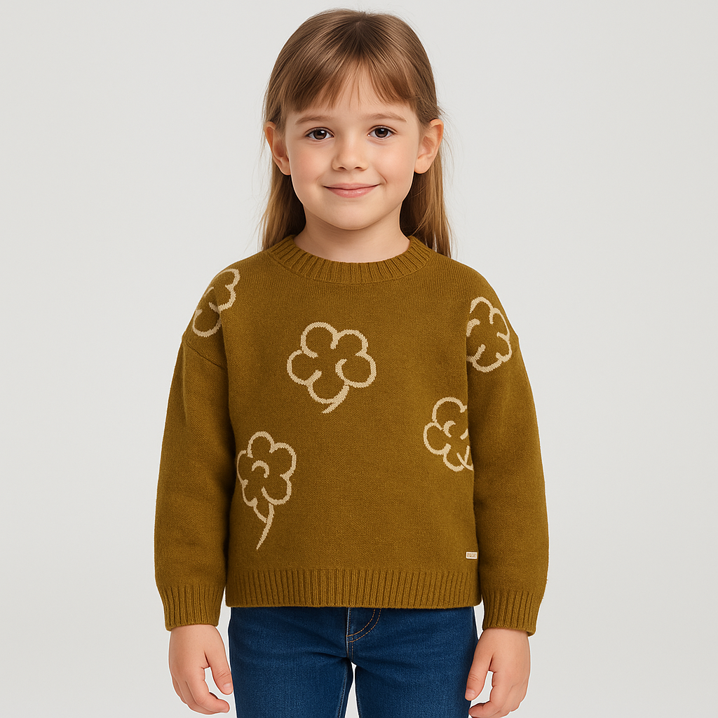 This playful floral sweater is the perfect mix of comfort and style for everyday wear. Designed in a warm mustard hue with whimsical flower motifs, it adds a cheerful touch to her wardrobe while keeping her cozy on cooler days. With its relaxed fit and ribbed trims, it’s a versatile piece that pairs effortlessly with jeans, leggings, or skirts.