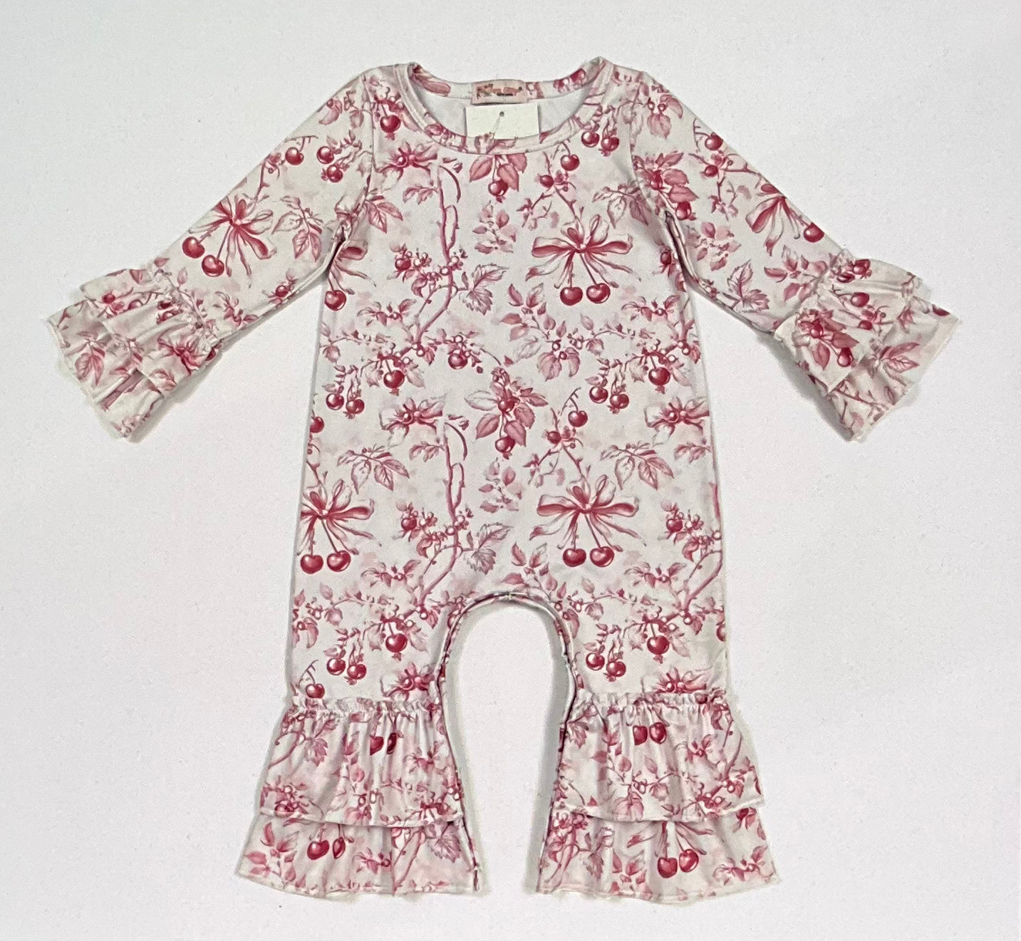 Full of fruity fun and feminine charm, our Cherries Romper is a sweet staple for your little one’s wardrobe! Featuring a pink base with dark pink accents of cherries, bows, and floral details, this romper is made for sunny days and playful moments. Ruffled sleeves and a ruffled bottom add extra cuteness, making it perfect for everything from playdates to picture days.