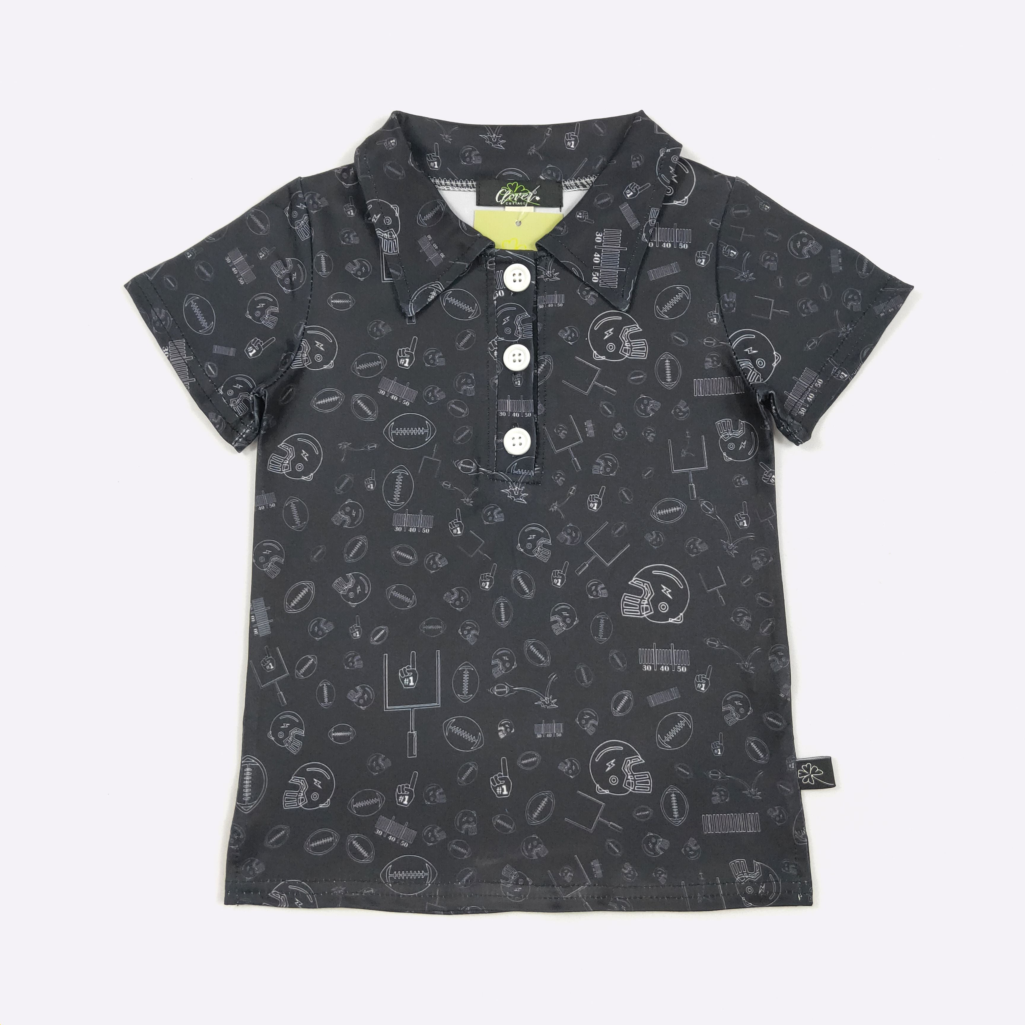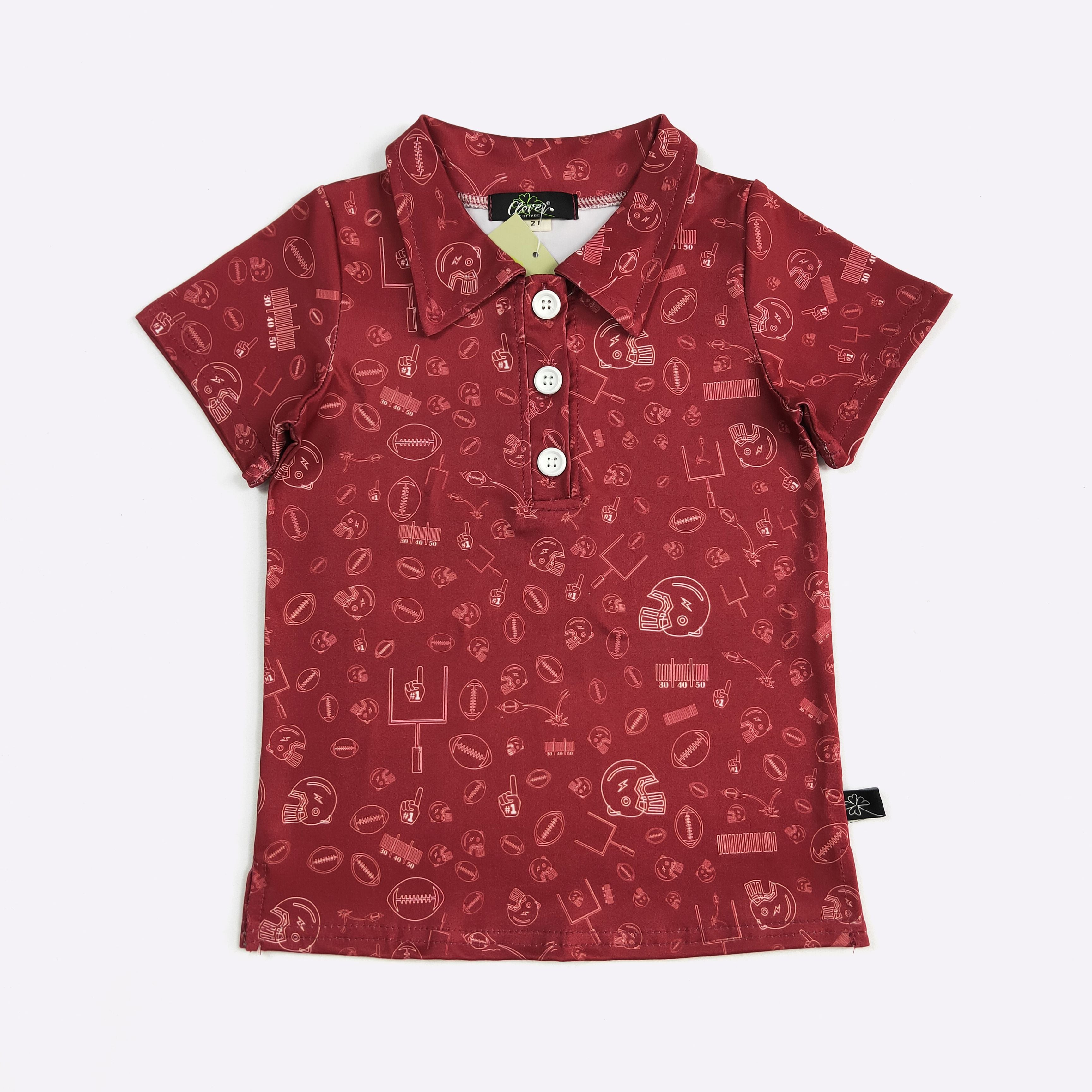 Score major style points with our Burgundy and Black Game Day Shirt – the perfect pick for little fans who love football season! Featuring playful “Field Goals” prints and a fun football pattern, this collared shirt brings together sporty charm and comfort. Finished with crisp white buttons and a classic fit, it’s great for tailgates, team spirit days, or cheering from the sidelines.
