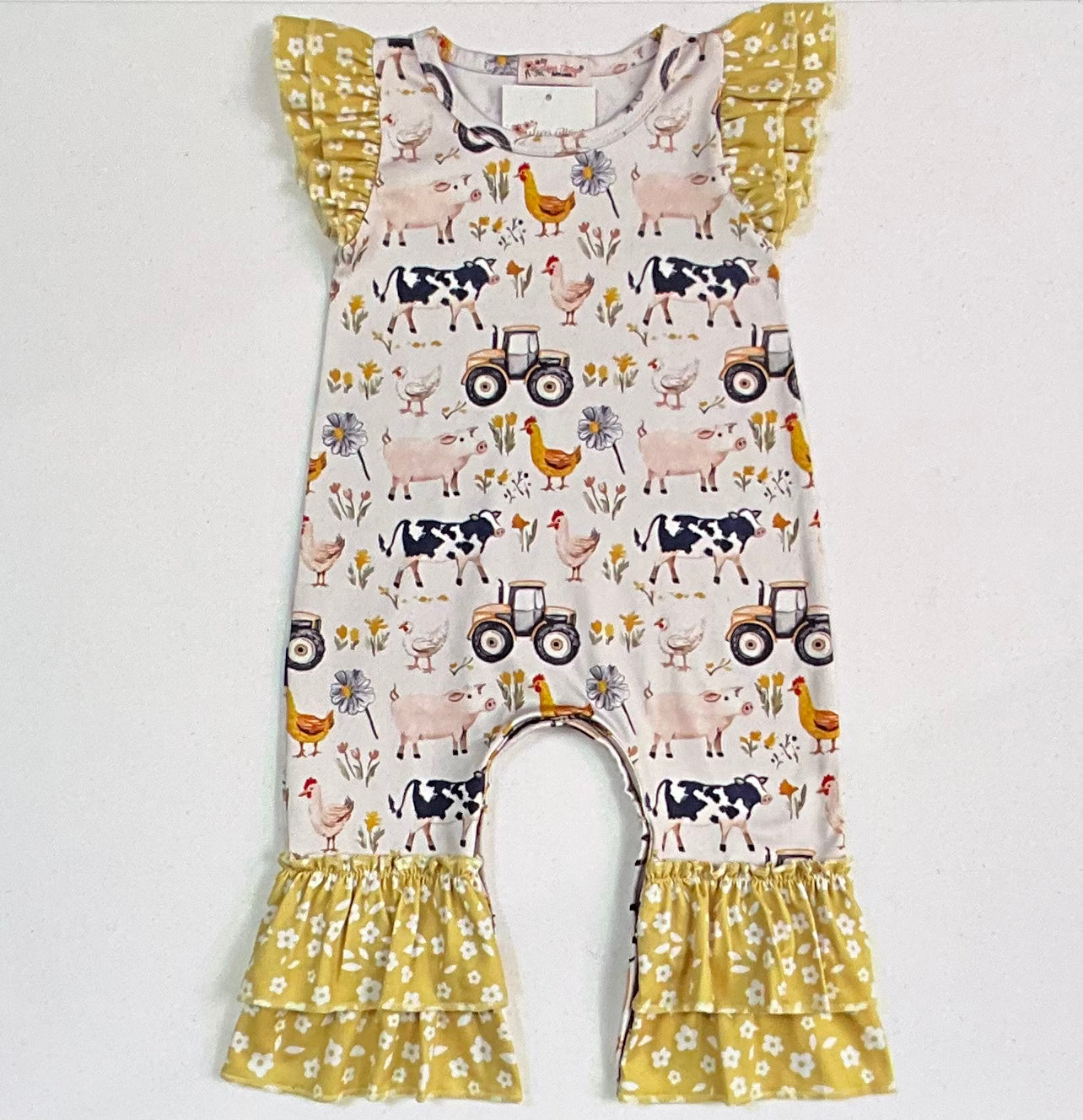 Bring the charm of the countryside to your little one’s wardrobe with our Harvest Farm Romper! This darling pink romper features playful farm details like barns, animals, and tractors, making it perfect for fall adventures. The yellow floral ruffled sleeves and matching ruffle trim at the bottom add a sweet pop of color and femininity to this cozy, all-in-one outfit.