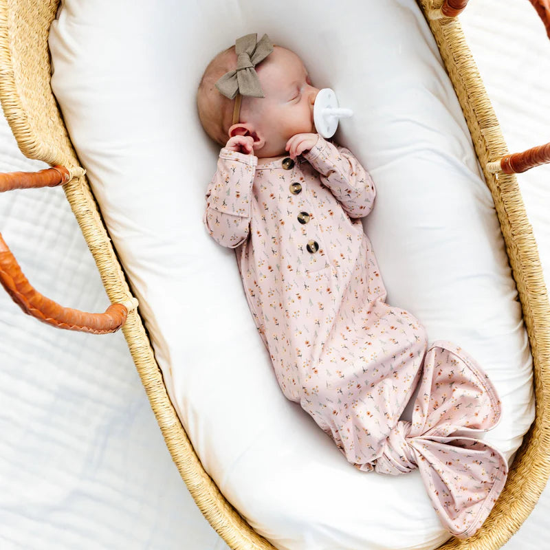The easiest tie-bottom outfit for day or night. Made for hassle free diaper changes and gentle dressing, designed with a button-down front and tie bottom for simple closure (no more snaps at 2am!). Fold over wrist cuffs are the most thoughtful finishing touch.