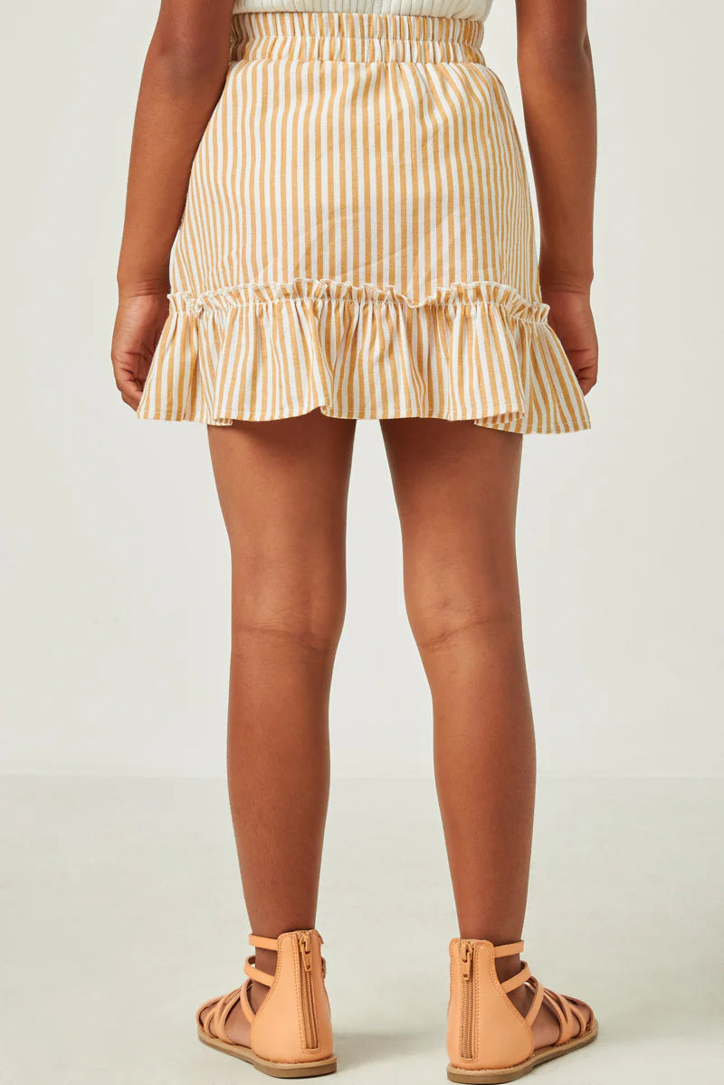 Add a playful touch to her outfit with the Mustard Stripe Ruffle Skirt. Made from soft, lightweight woven fabric, this skirt features a charming striped pattern and an asymmetric ruffle hem that moves beautifully. The stretchy elastic waistband ensures a comfortable fit, making it perfect for twirling through sunny days or dressing up for special occasions.