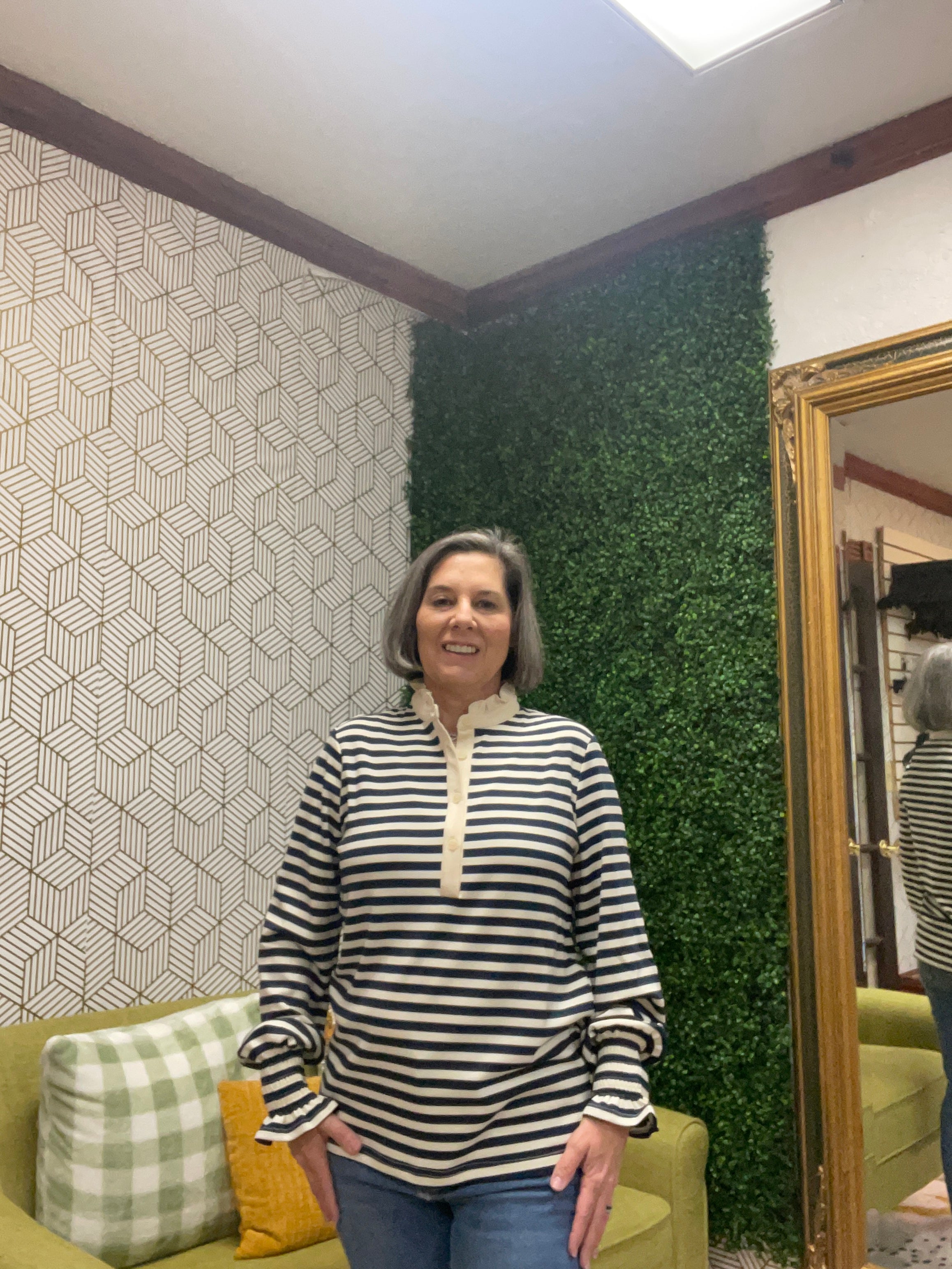 Navy and white striped shirt with a charming ruffle collar, half button placket, and smocked cuffs. Crafted from soft jersey fabric with long sleeves for comfortable year-round wear. The classic stripe pattern pairs beautifully with denim or tailored bottoms for an effortlessly chic look.