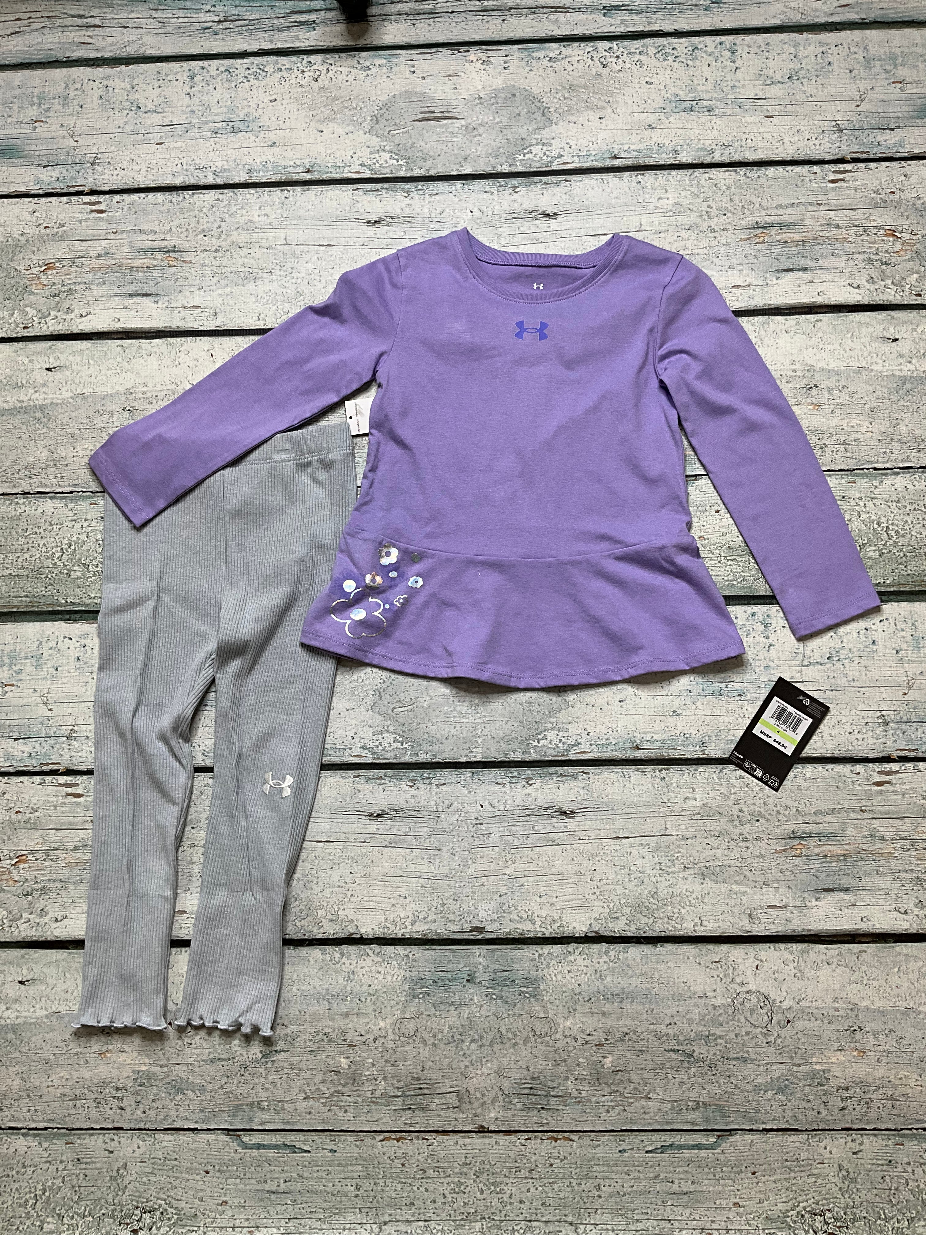 This adorable Under Armour Transparent Tunic Leggings Set blends sporty comfort with playful charm. The set features a purple tunic top with a flared bottom and sweet floral accents, paired with grey leggings finished with ruffled hems. Designed for movement and style, it’s perfect for school, playdates, or everyday fun.