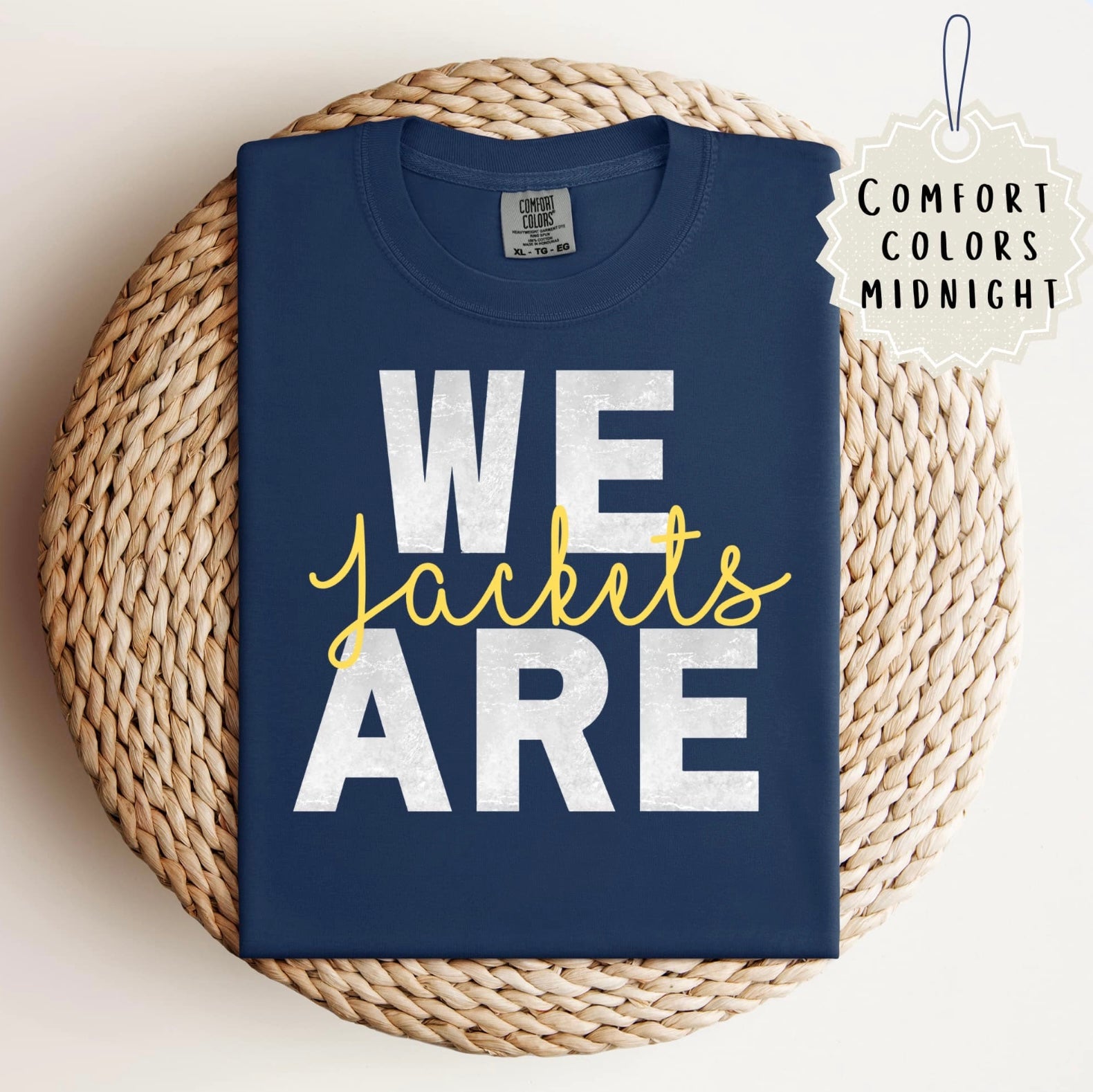 Show your school spirit in cozy style! Our “We Are Jackets” Comfort Colors Shirt is a must-have for fans of all ages. Featuring “We Are” in bold white and “Jackets” in striking gold across a rich navy Comfort Colors tee, this shirt is perfect for cheering from the stands or strolling around town.