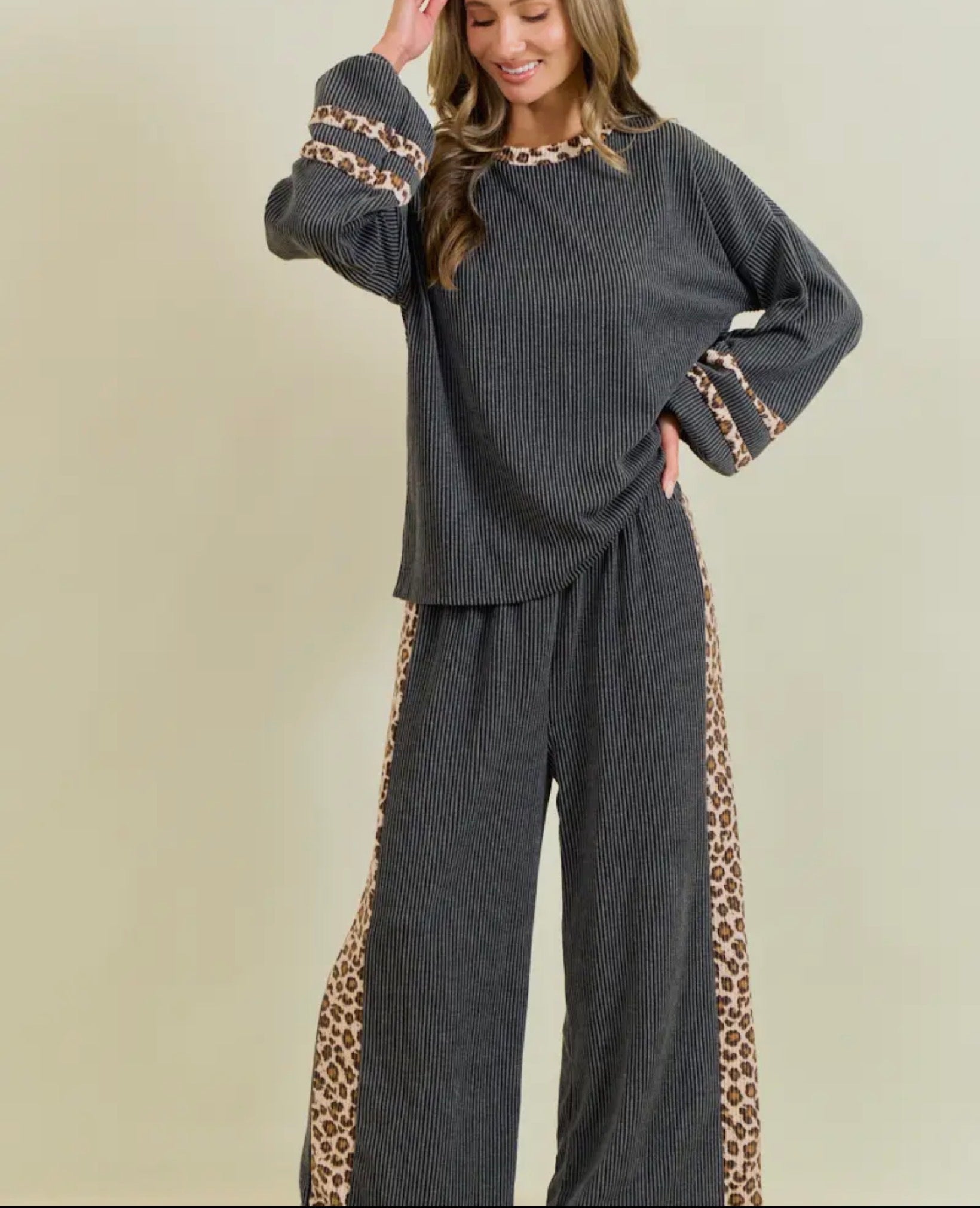 Complete the look with our Charcoal Pants, crafted from the same soft ribbed fabric for ultimate comfort and style. These charcoal joggers feature sleek leopard-print side stripes that add a bold, sporty edge while keeping the vibe effortlessly chic.